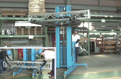 これまで天井設備材の取付工事では、足場などの専用設備やフォークリフトをはじめとする複数の機械が必要になるため、準備作業に時間がかかっていました。また、重い部材を高所に運搬・設置するという危険な作業がボトルネックになっていました。