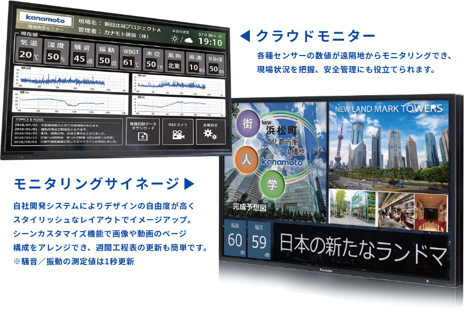 騒音や振動の測定数値をリアルタイムに表示することが可能です。近隣への配慮などを意識した現場環境の整備に役立ちます。