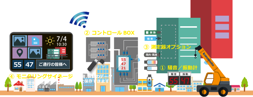 | ①騒音/振動計 | 従来の騒音、振動表示器(LED)※SDカード記録 |