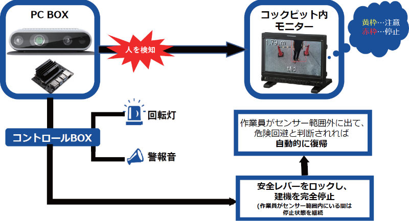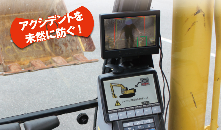 深度センサーによって3D情報を取得するデプスカメラ、Al による物体認識機能などの先端技術を駆使し、建機使用時の“後方未確認による事故”を未然に防止。建機後方に設置したカメラのセンサー範囲内に人を検知すると、強制的に停止させる接触防止システムです。