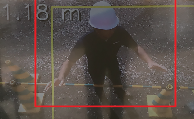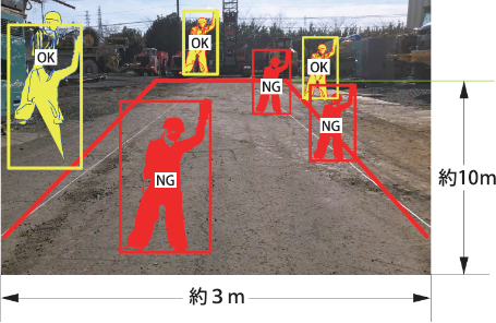画面のようにパネルで上半身が隠れ、たとえ脚だけしか見えなくても「人」として認識し、建機を自動停止。Alによる高い認識性も大きな特長です。