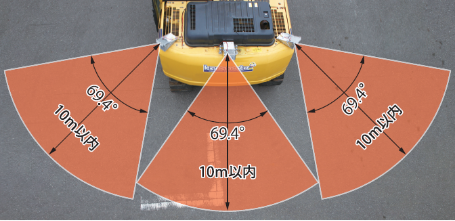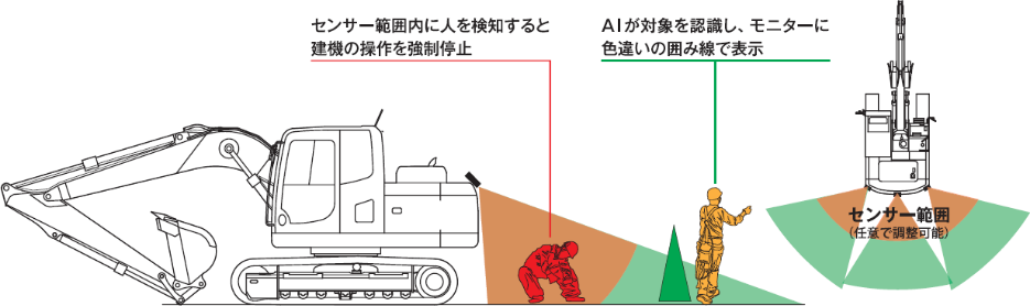 センサー範囲内に人を検知すると建機の操作を強制停止