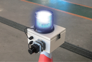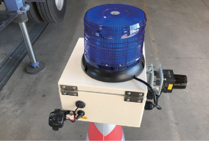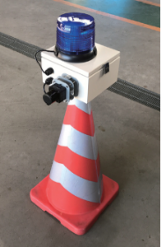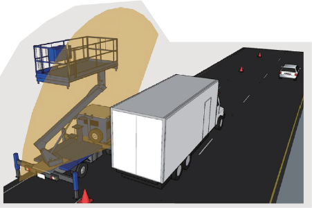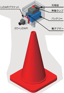 橋脚やトンネルなどの工事に高所作業車を使用する際、旋回したバケットが規制帯からはみ出す事故を防止するために開発した「はみ出しまセンサー」。事前に設定した検出エリアからバケットがはみ出すと”音と光”で警告し、ヒューマンエラーによる接触事故を未然に防ぎます。