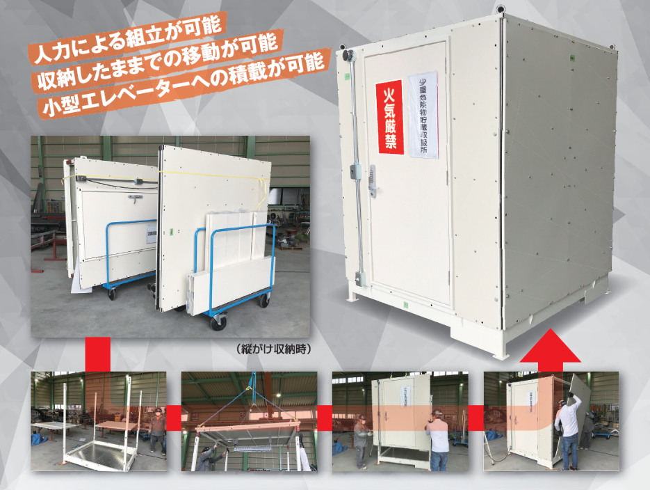例えば、高層ビルの建設現場。これまで危険物倉庫を上層階に搬入・設置する事は困難でしたが、現地で”人力”によって組み立てることができる当製品なら、階数を選ばずに搬入・設置が可能です。
