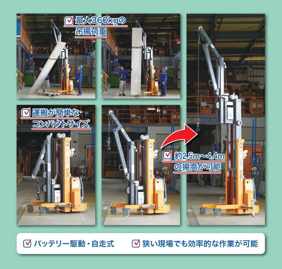 厚くて長い間仕切パネルなどの建込み作業を、安全かつ効率的に行えるバッテリー式の「ウォールリフター」。フォークリフトが入れないような狭い現場でも、自走式・コンパクトサイズの当機ならスムーズな揚重が可能です。排ガスを発生しない環境性の高さも特長のひとつ。最大360kgの吊揚荷重を誇り、鉄骨建方などにも対応することができます。
